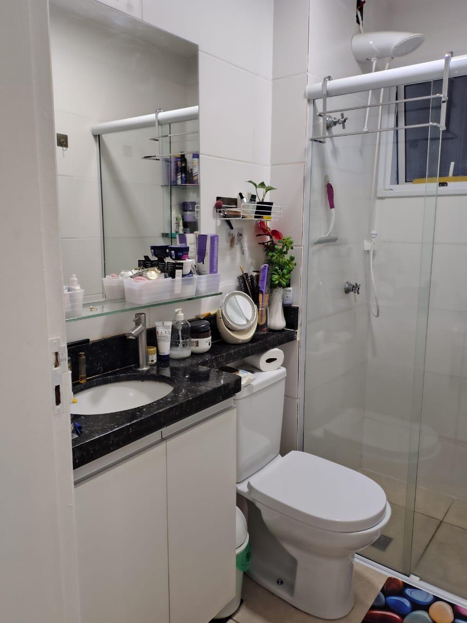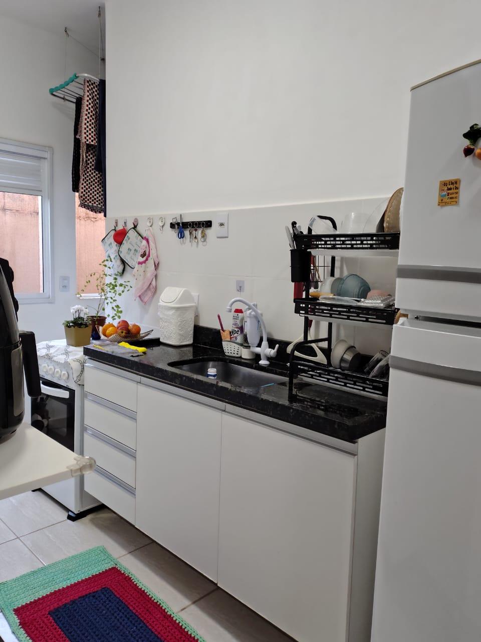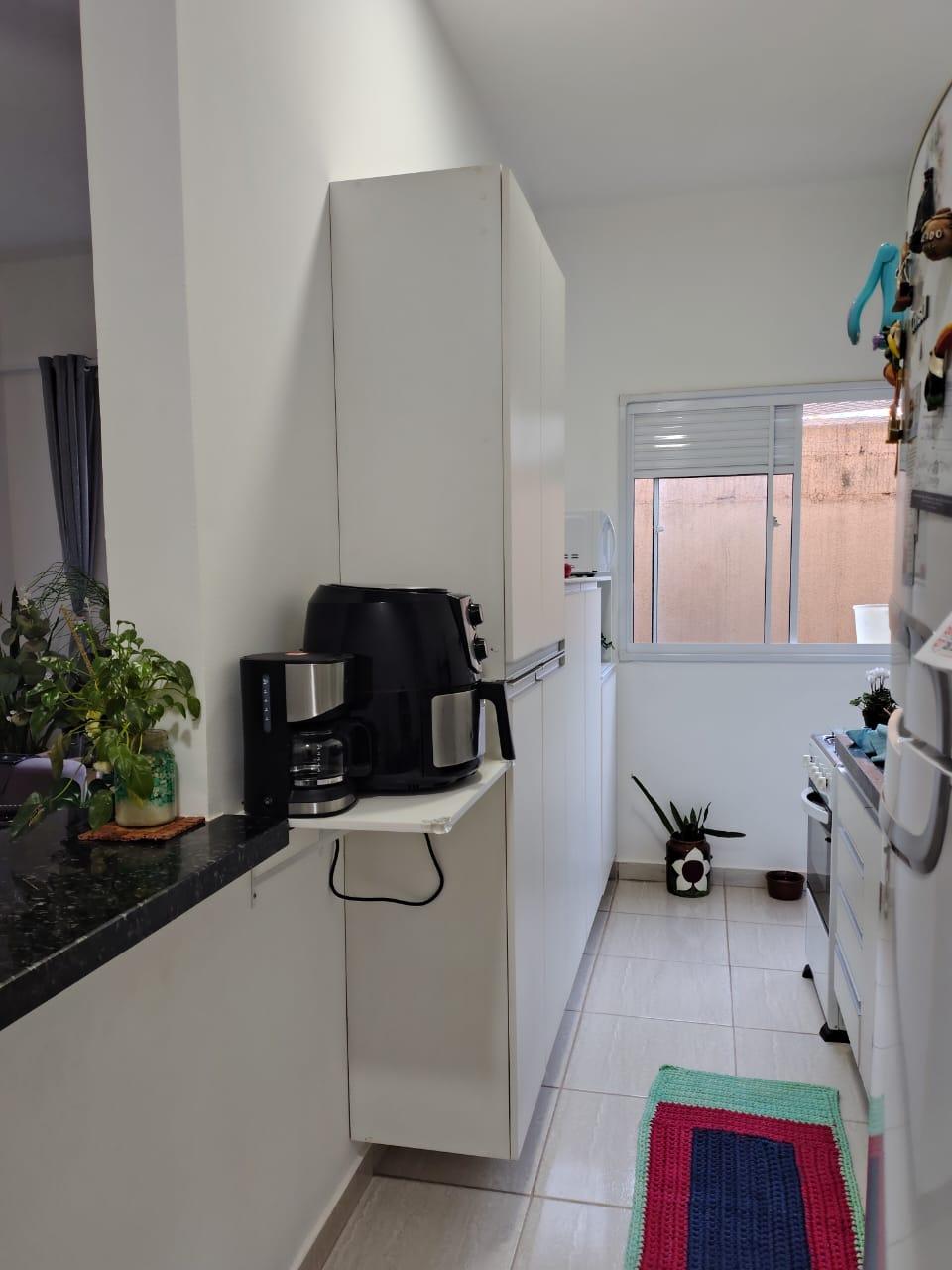 box de blindex, cozinha com armários, área de serviço e vaga de garagem para 2 veículos.