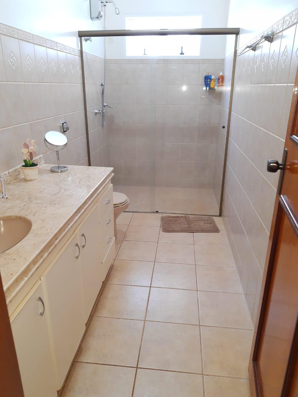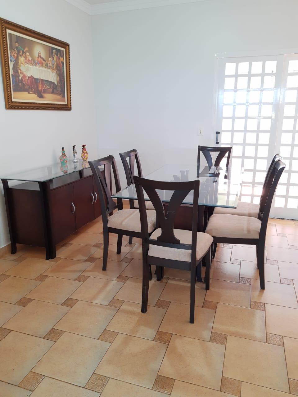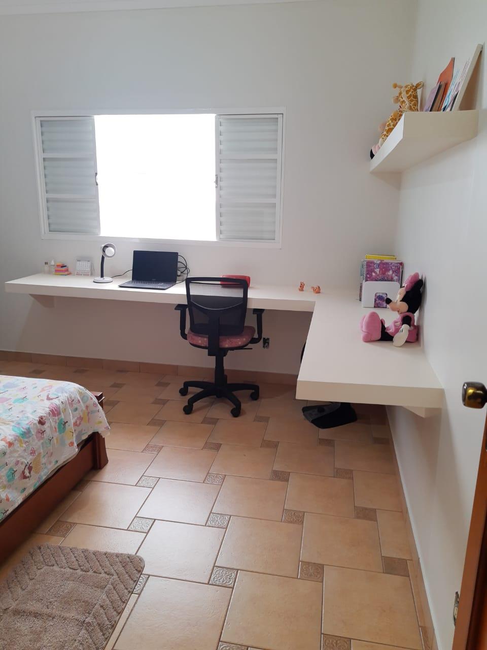 No pavimento superior, o imóvel conta com 3 quartos, sendo 1 suíte, banheiro social, sala de TV ampla, sala de jantar e cozinha com balcão e armários. Possui garagem para 2 veículos.
