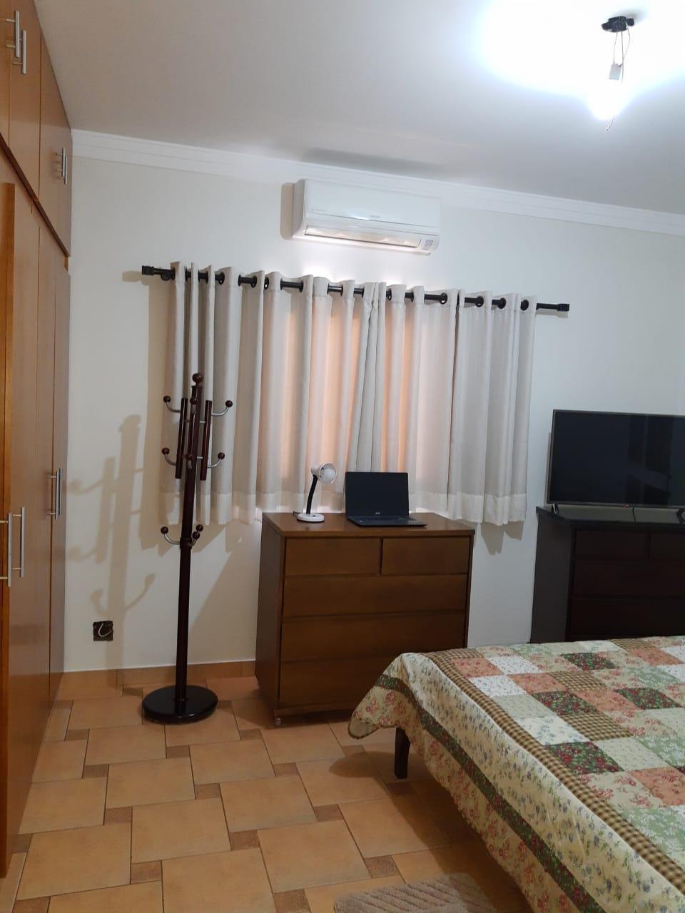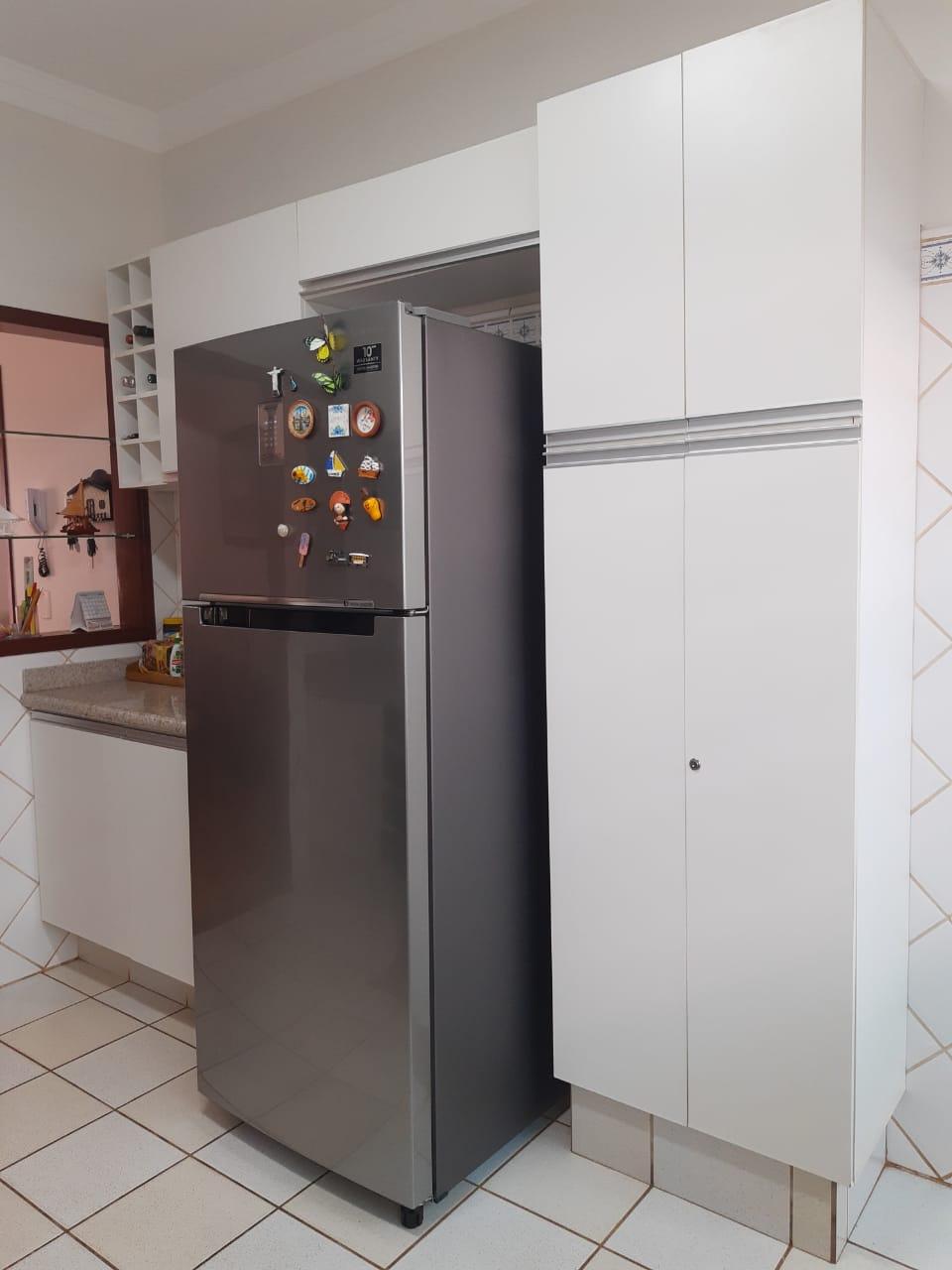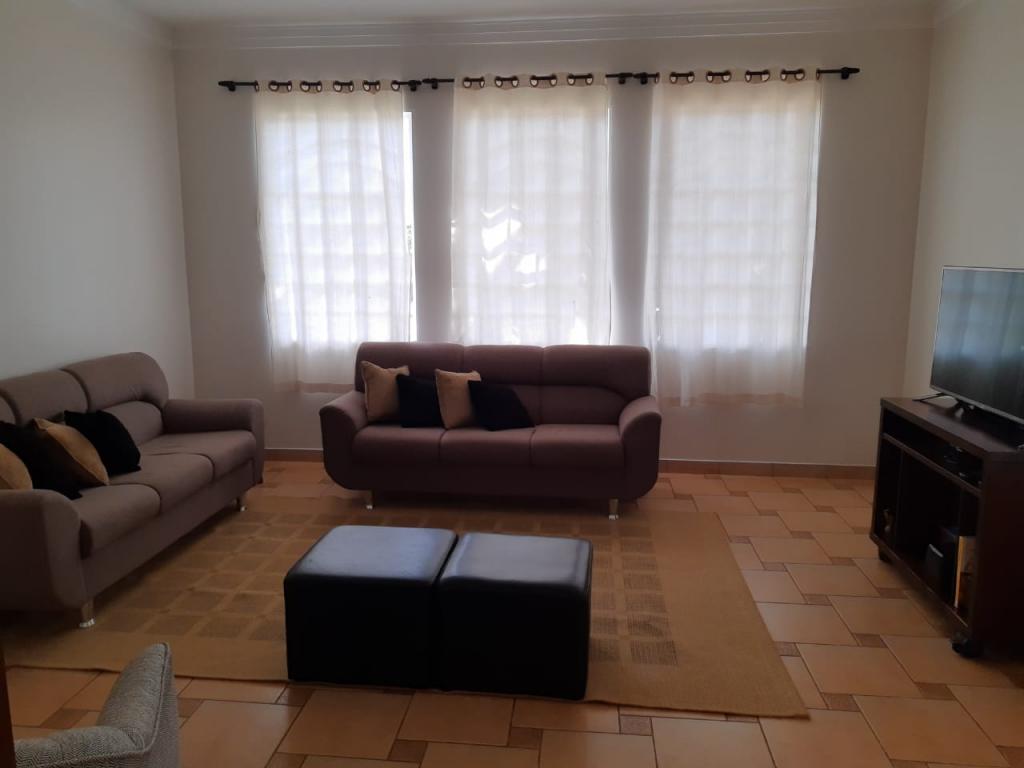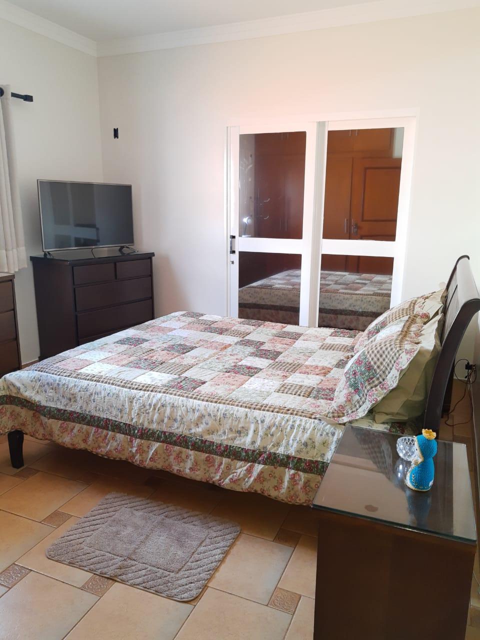 No pavimento superior, o imóvel conta com 3 quartos, sendo 1 suíte, banheiro social, sala de TV ampla, sala de jantar e cozinha com balcão e armários. Possui garagem para 2 veículos.