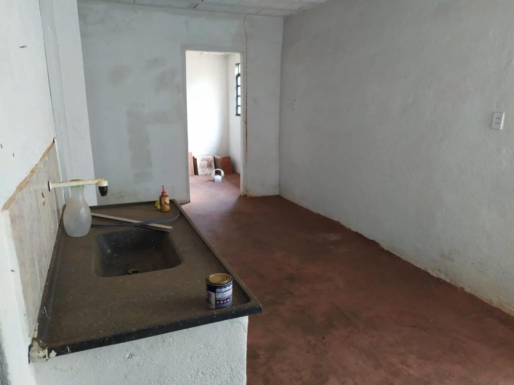 Uma casa com 1 dormitório, sala de estar, cozinha, banheiro social e quintal pequeno.